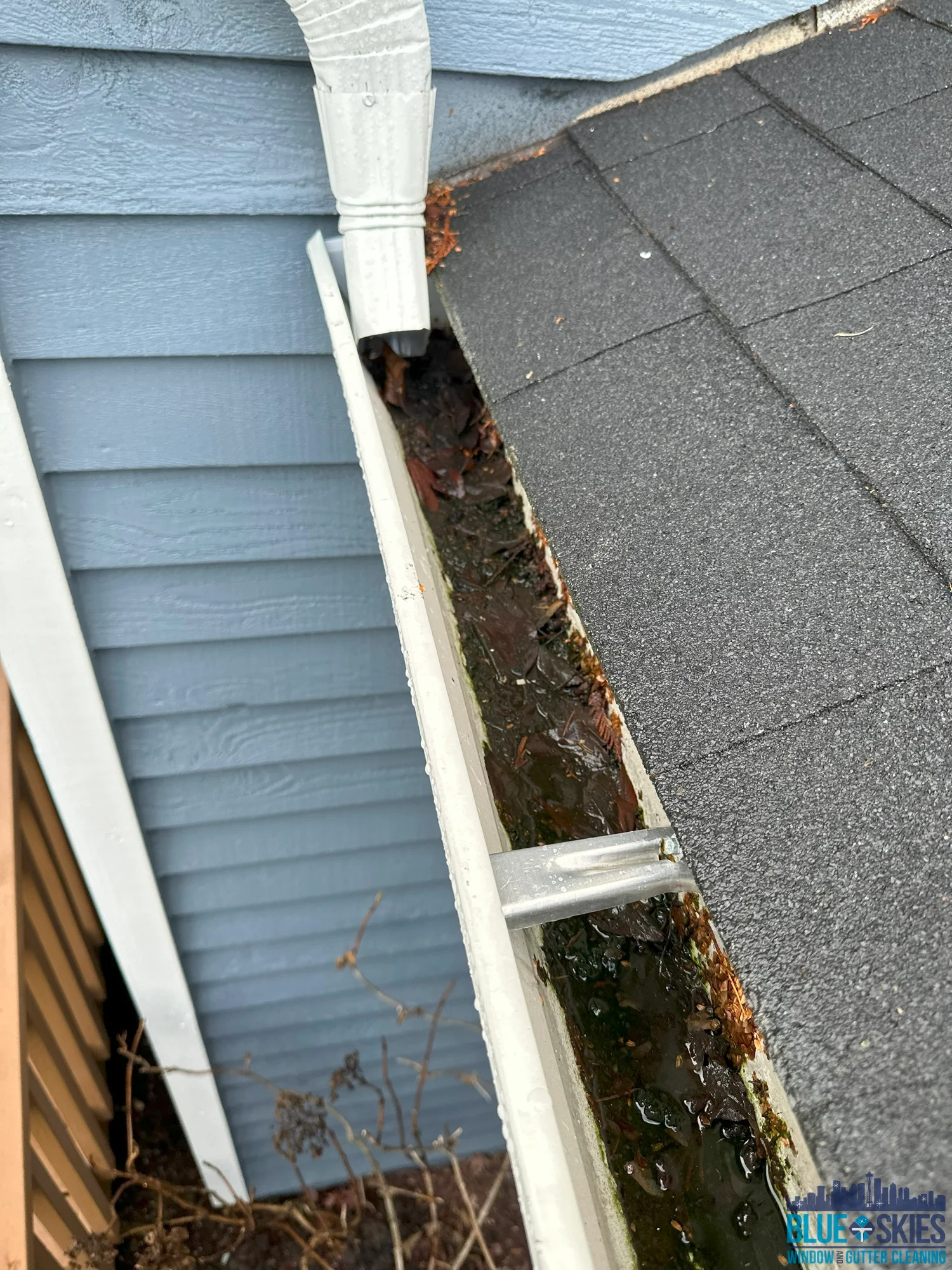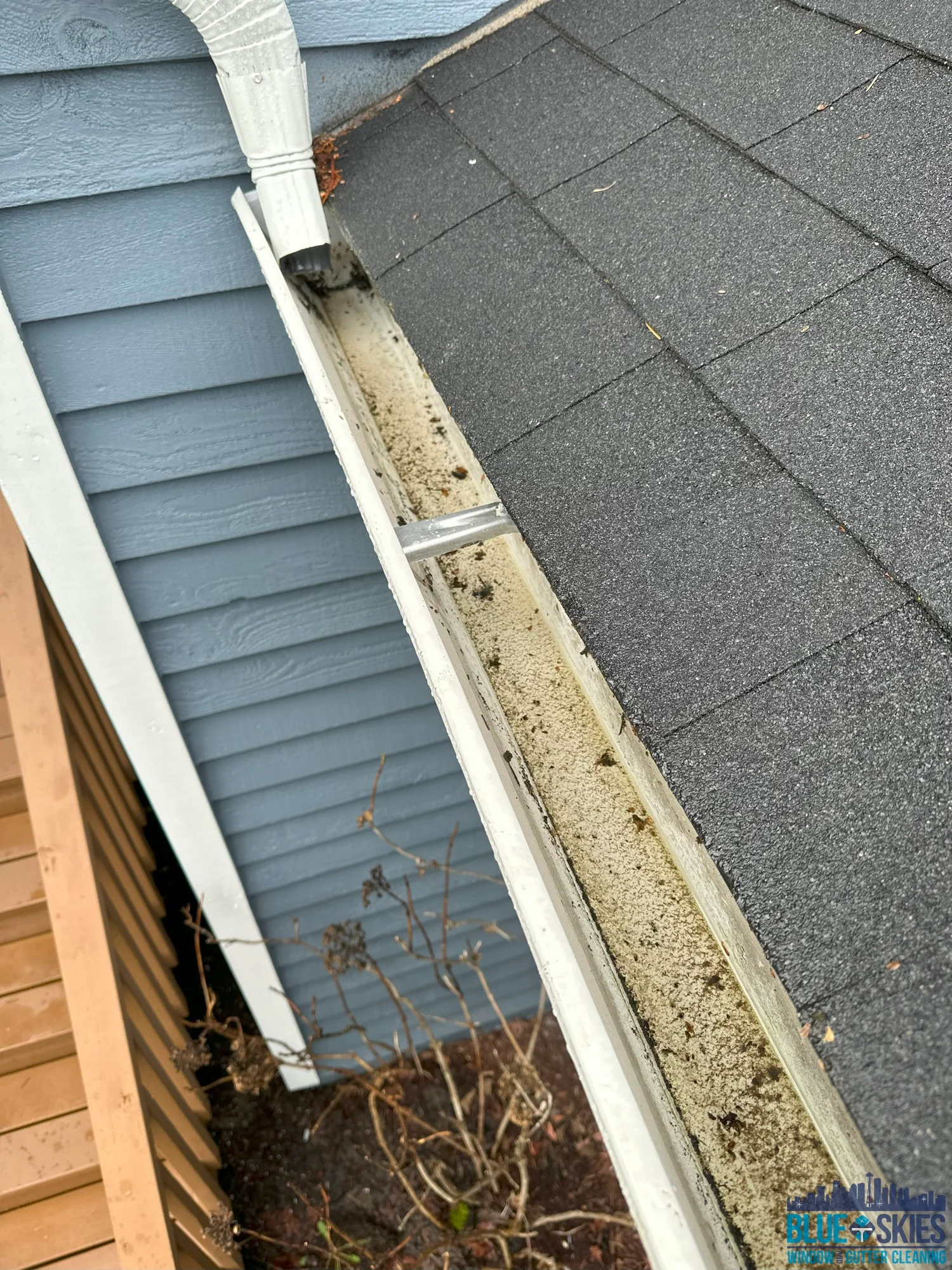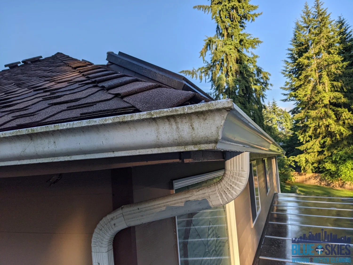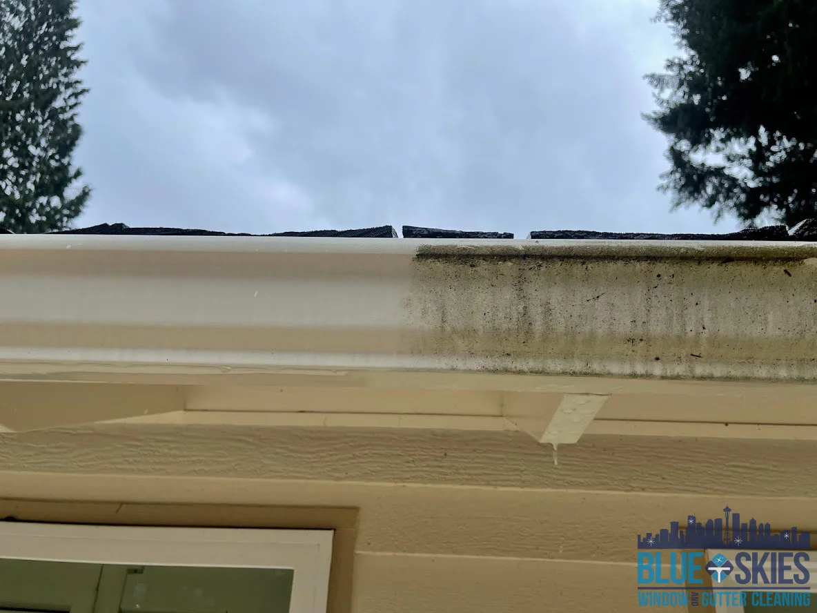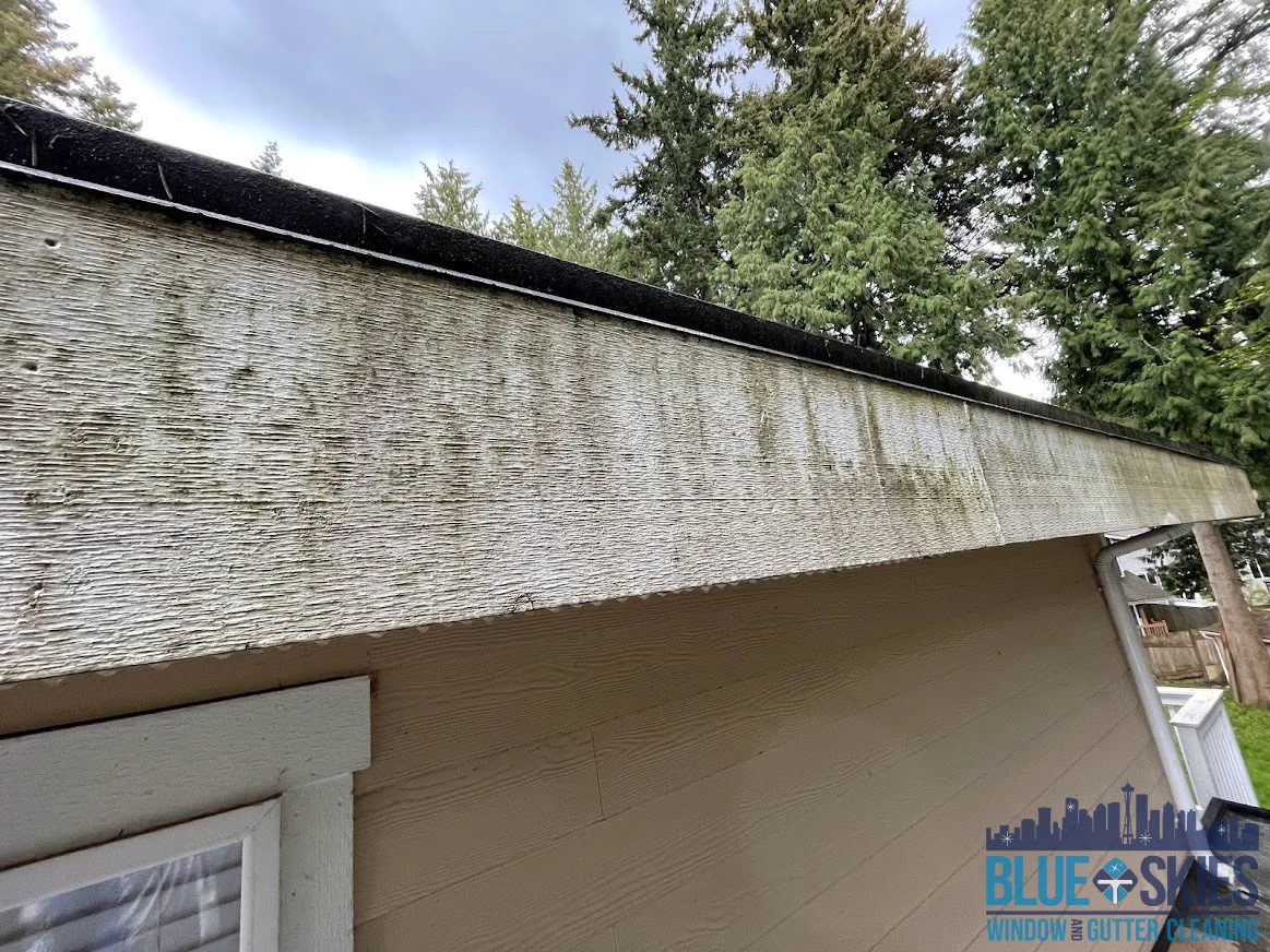 Exterior cleaning can improve your home's curb appeal; this house needs gutter brightening and siding soft washing.