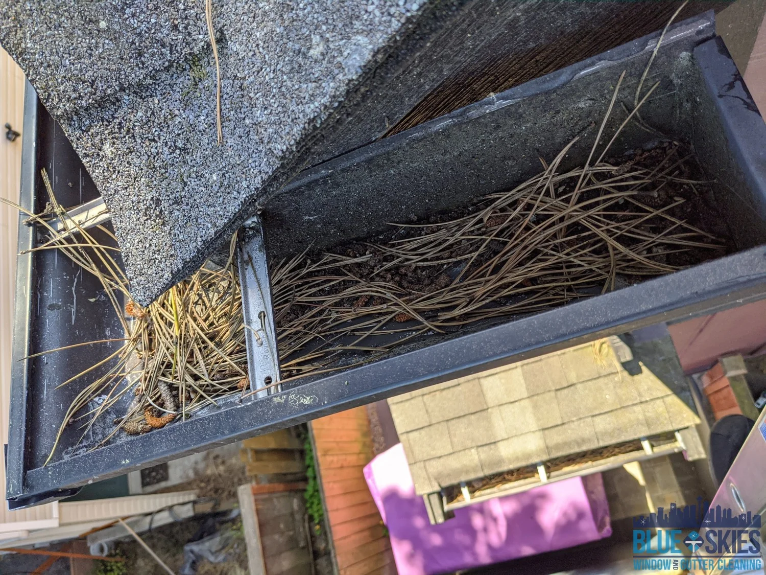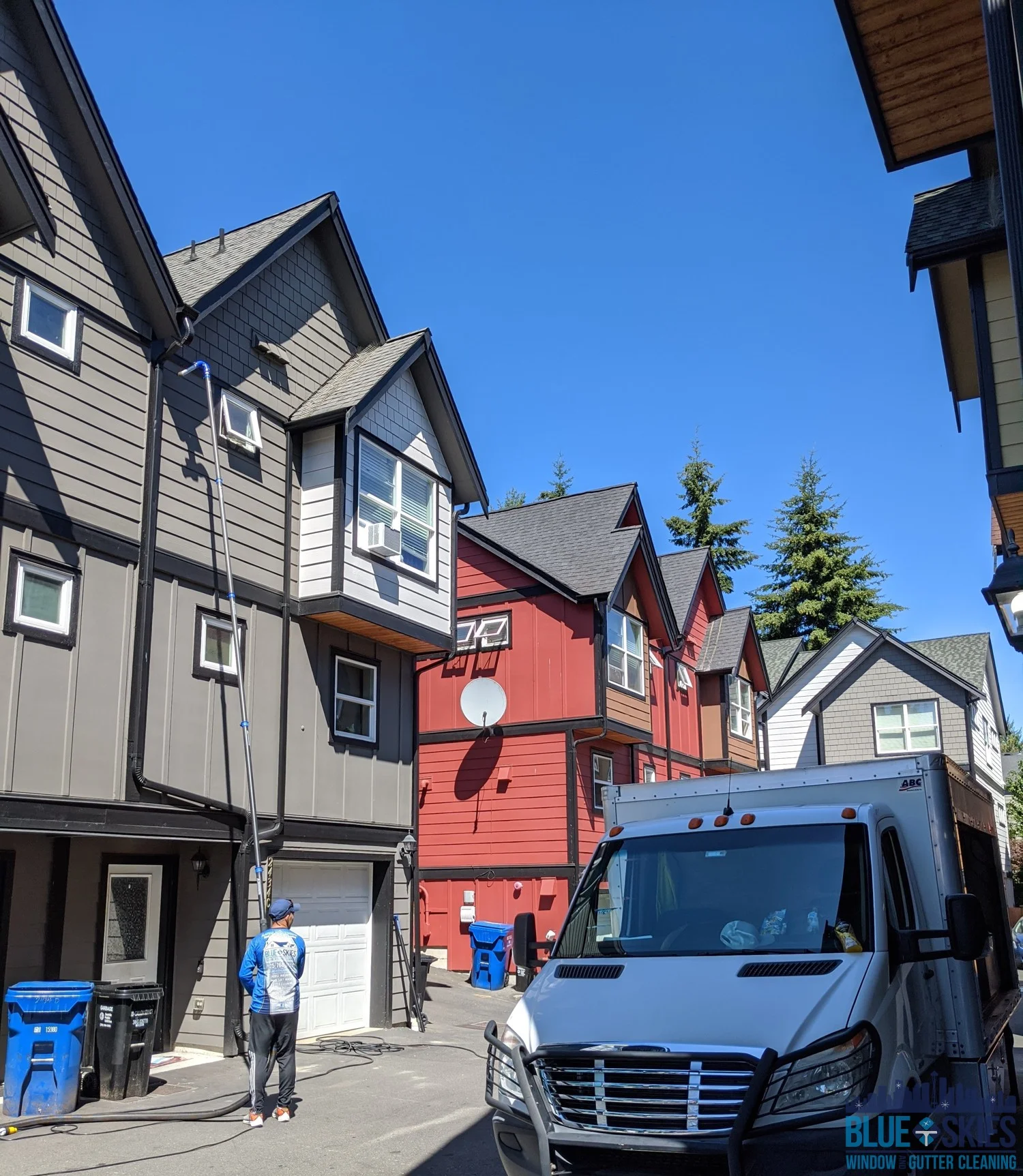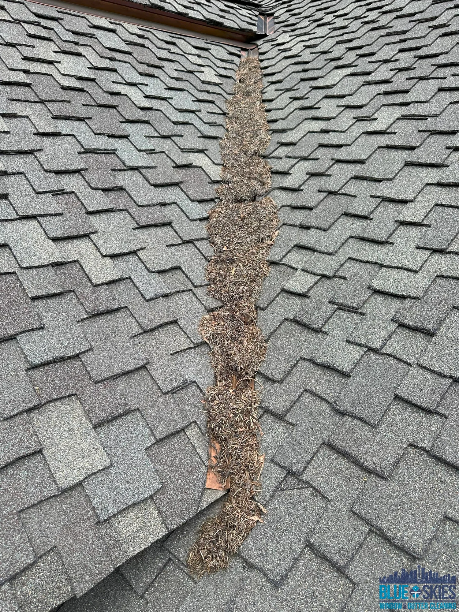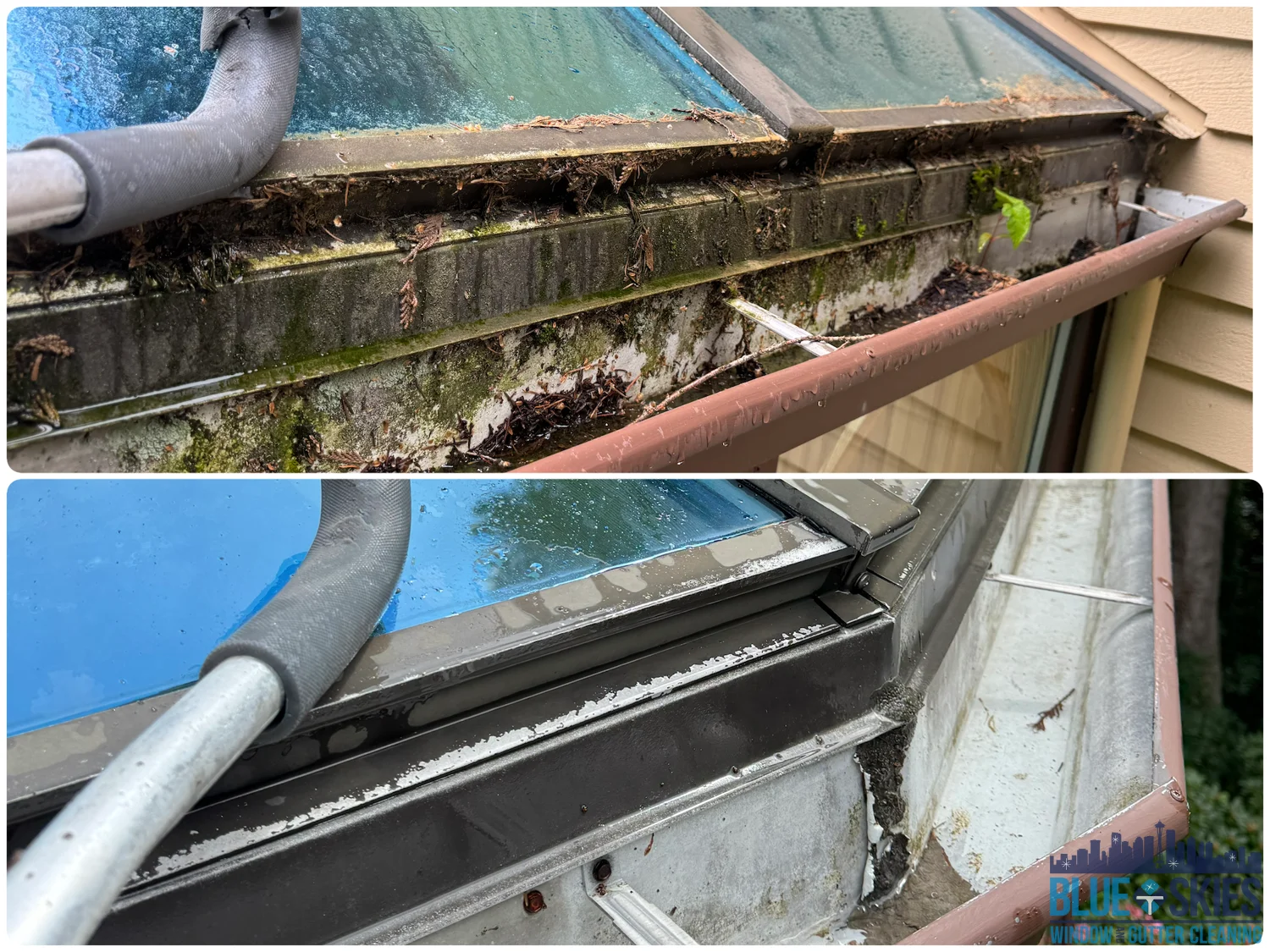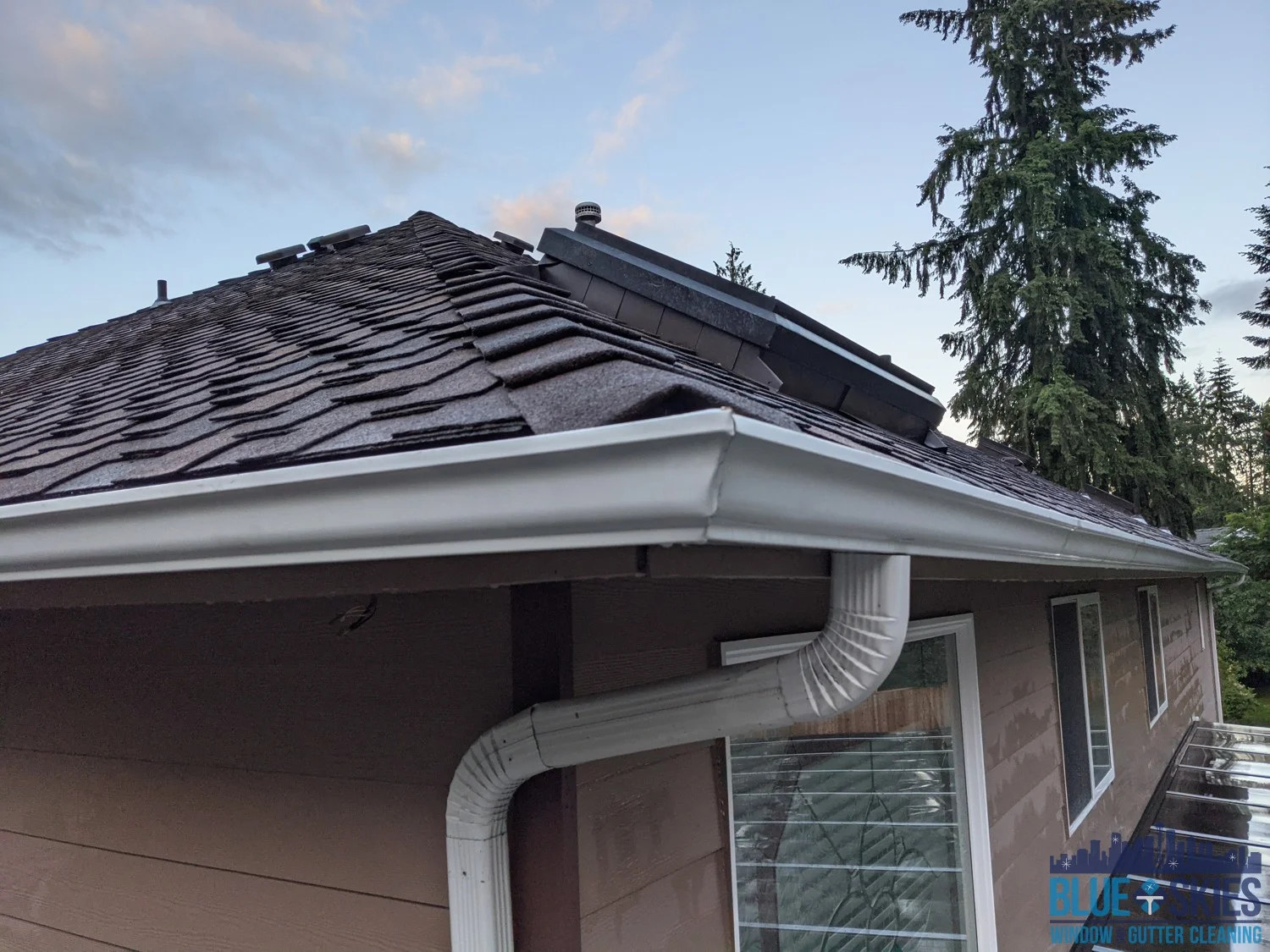 Exterior cleaning can improve your home's curb appeal; this house needs gutter brightening and siding soft washing.