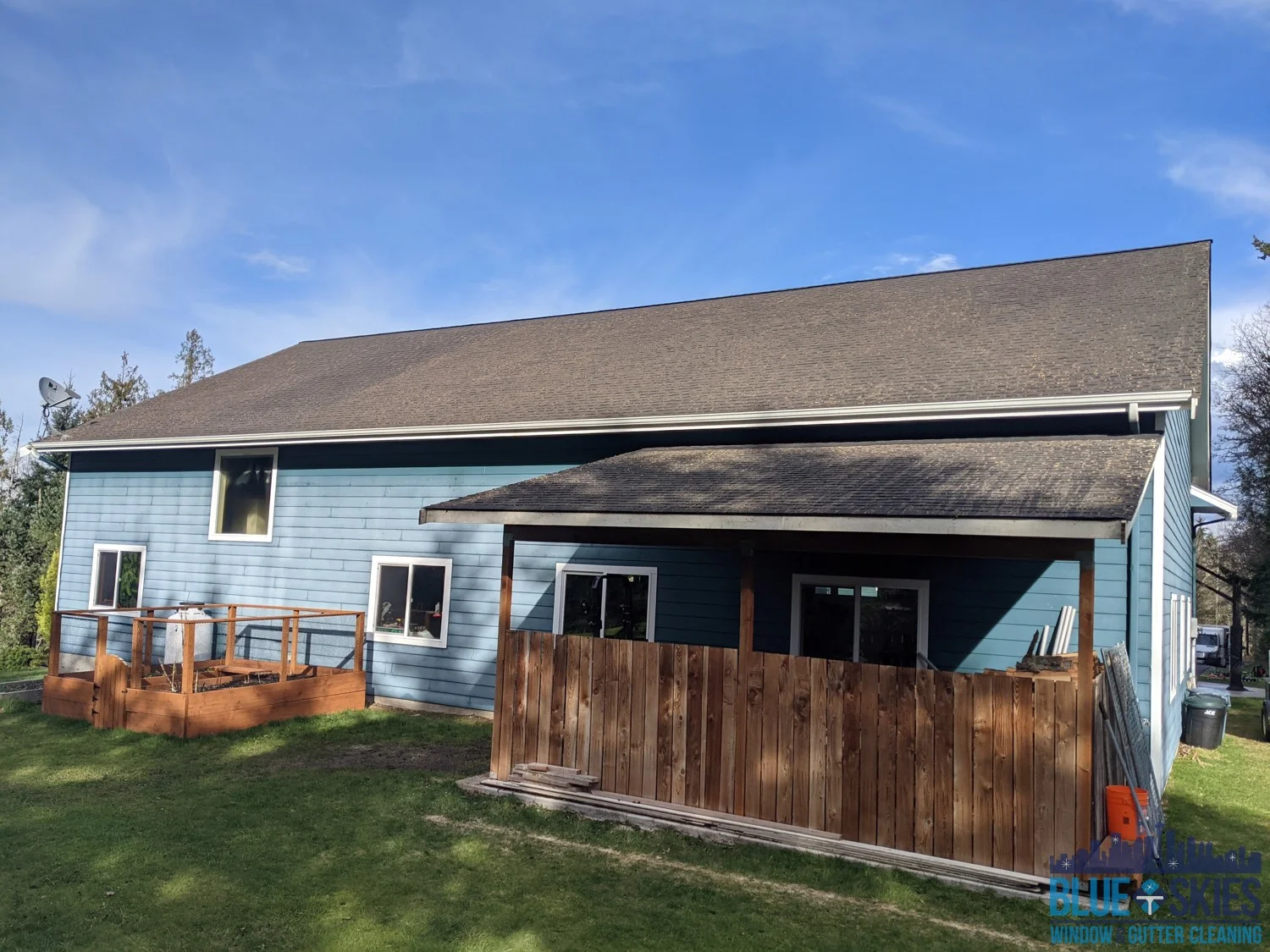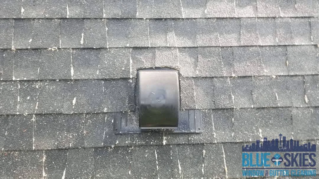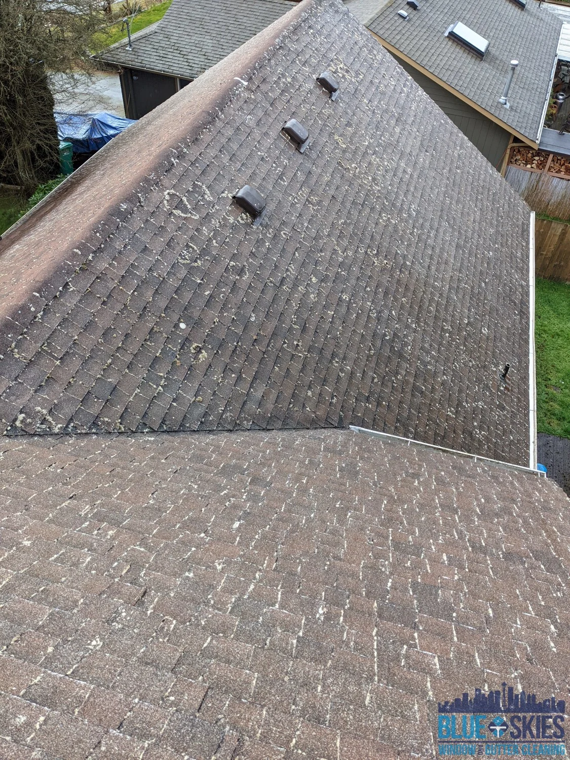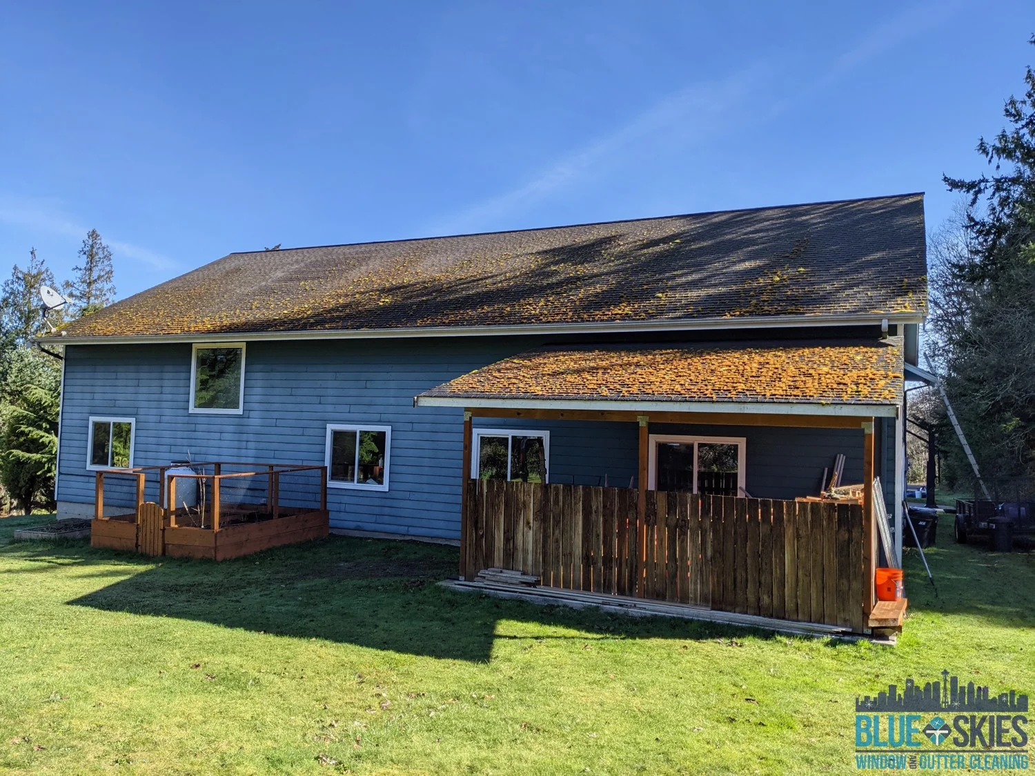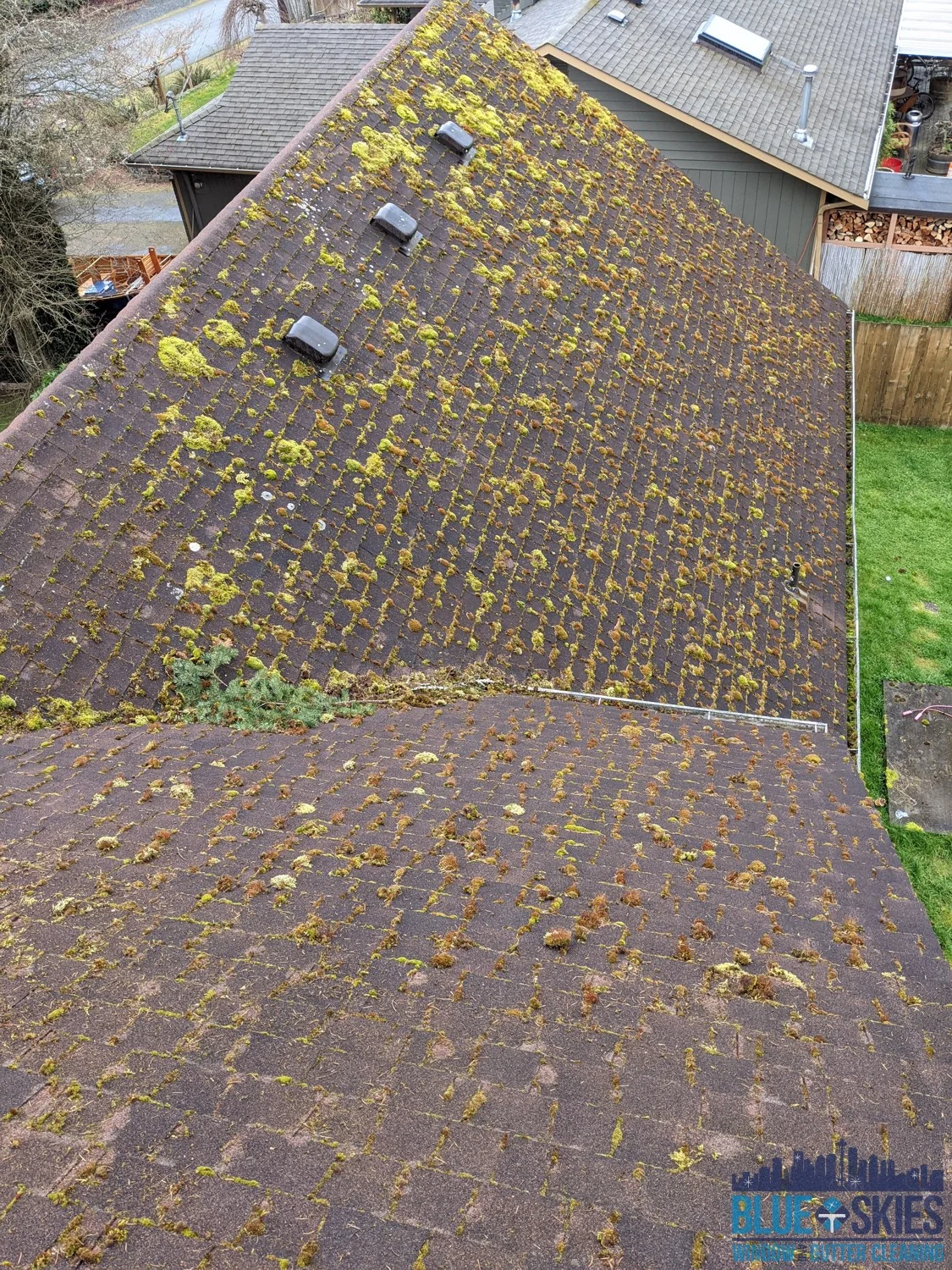 This blue home shows a roof with a heavy algae and moss infestation before our soft wash cleaning service restored its original appearance.