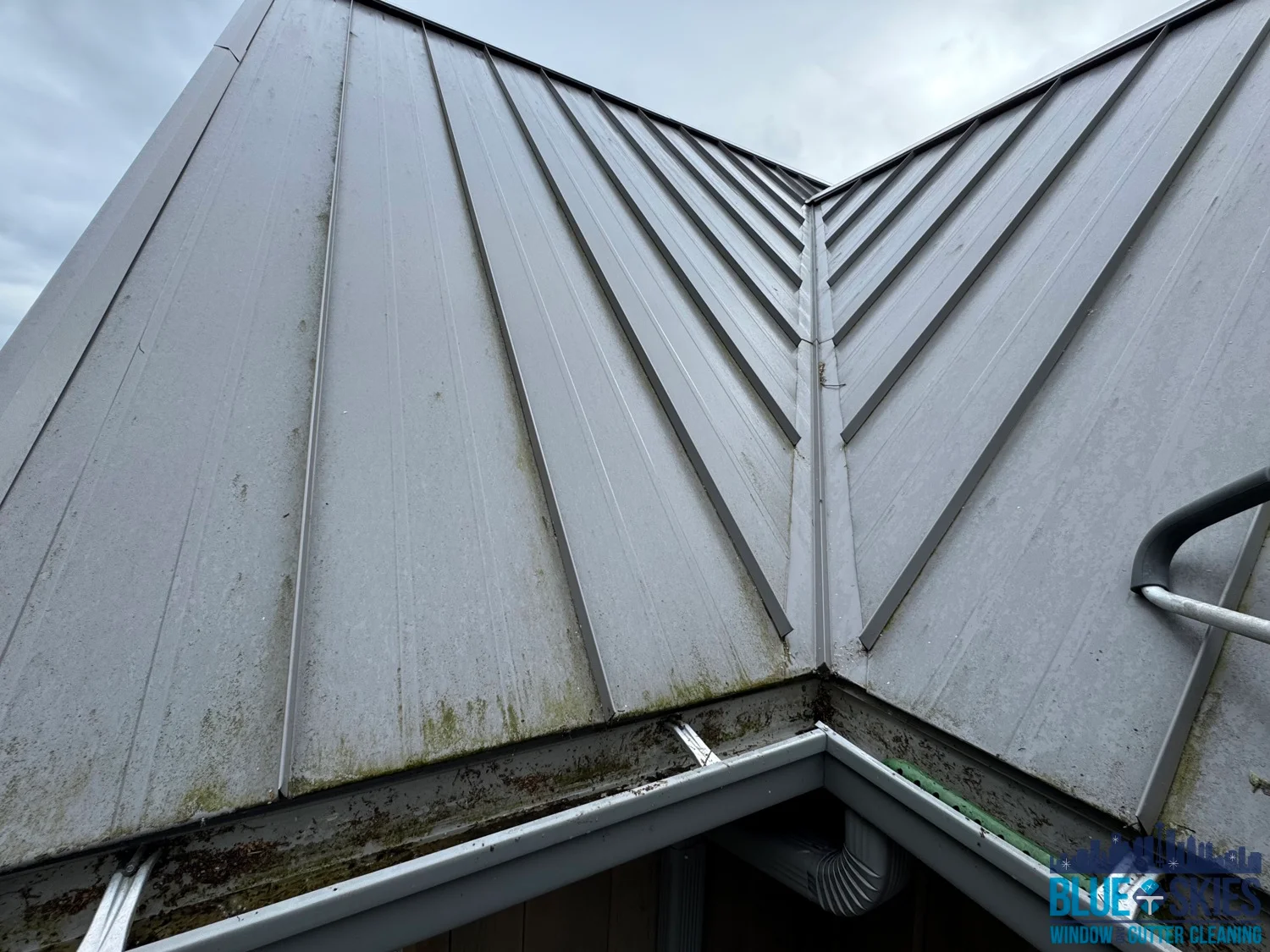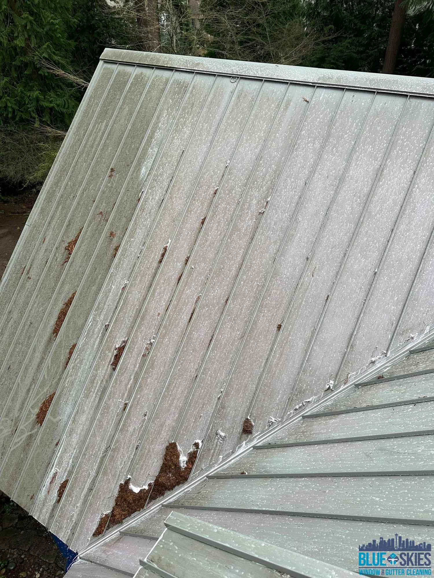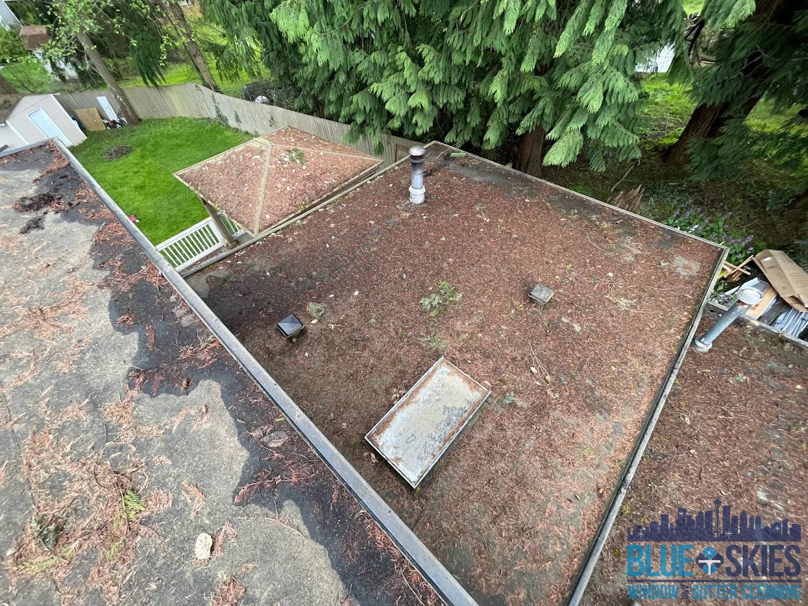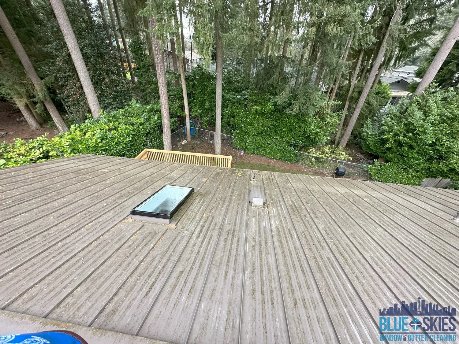 This blue home shows a roof with a heavy algae and moss infestation before our soft wash cleaning service restored its original appearance.