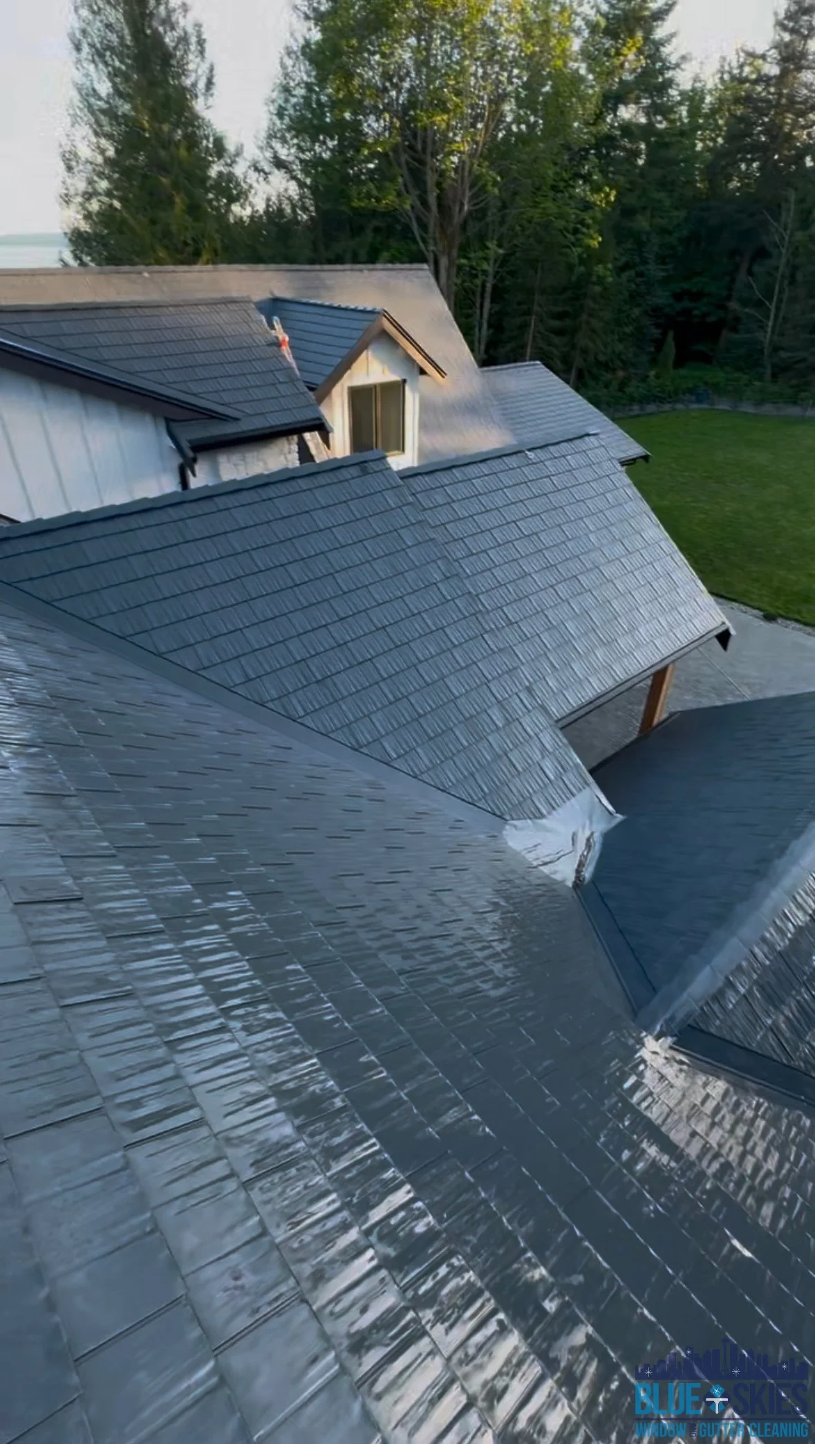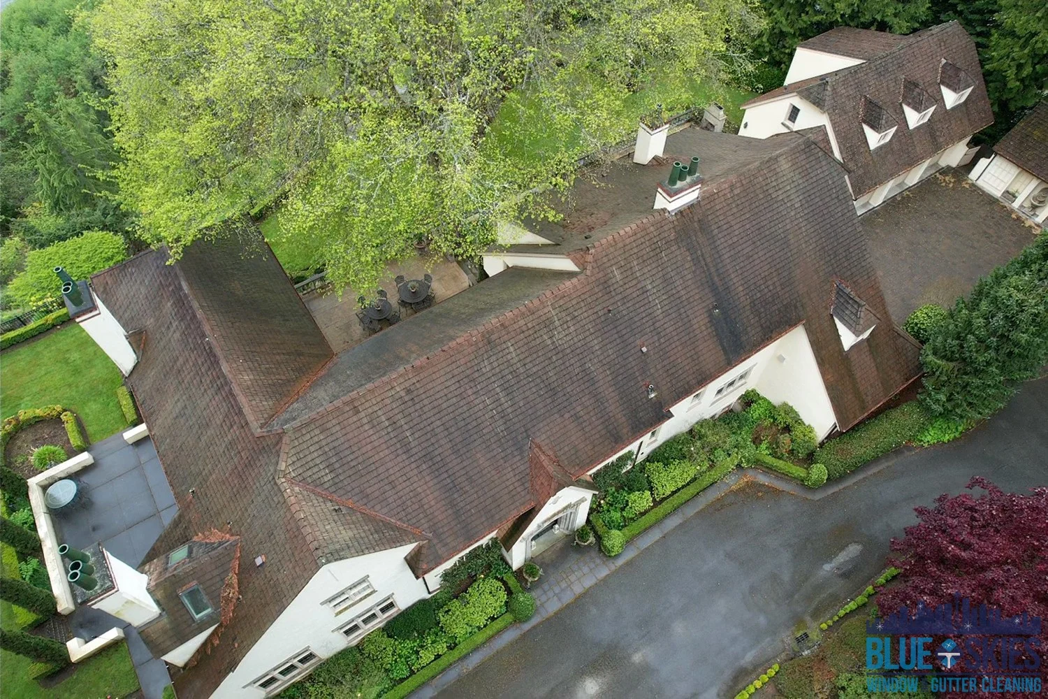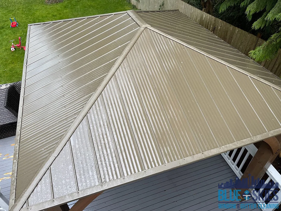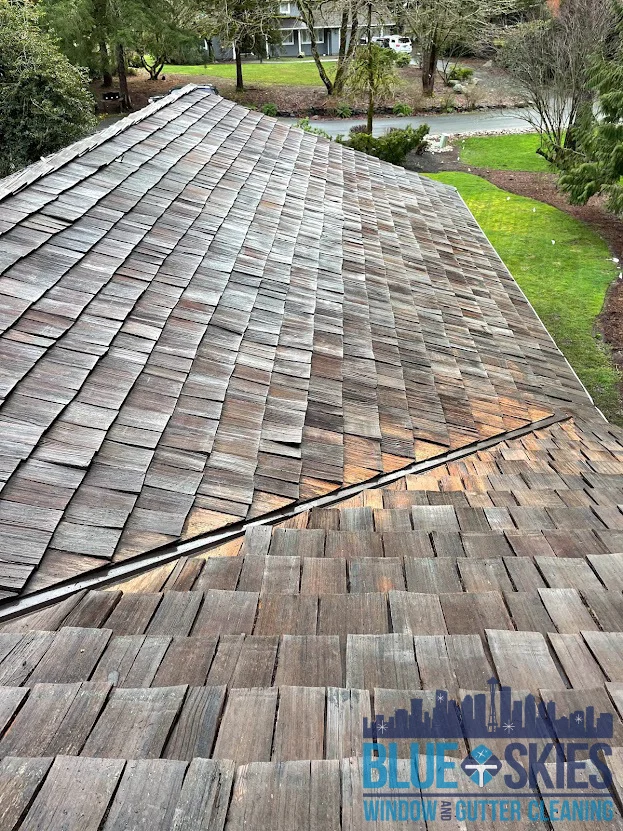 Our team specializes in residential soft wash roof cleaning, restoring beauty and protecting the integrity of your home's roof, as seen here.