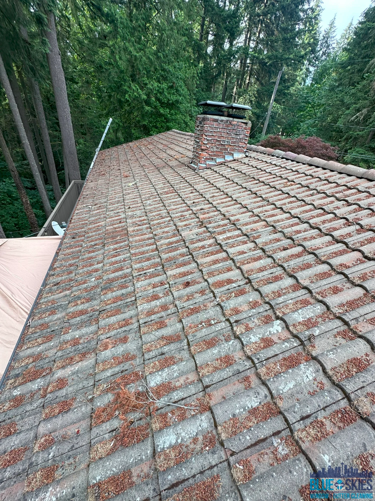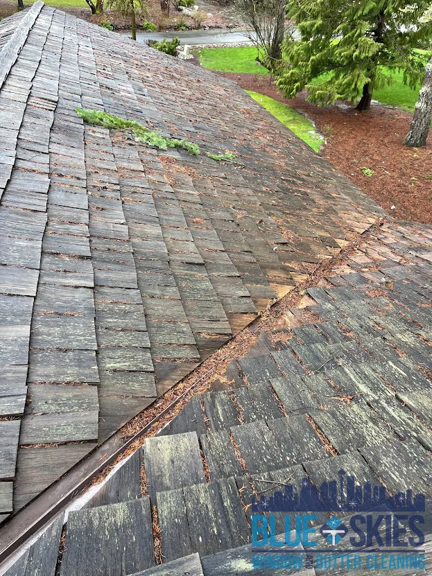 Before soft wash roof cleaning: A residential cedar shake roof covered with organic growth and debris, showcasing the need for professional cleaning.